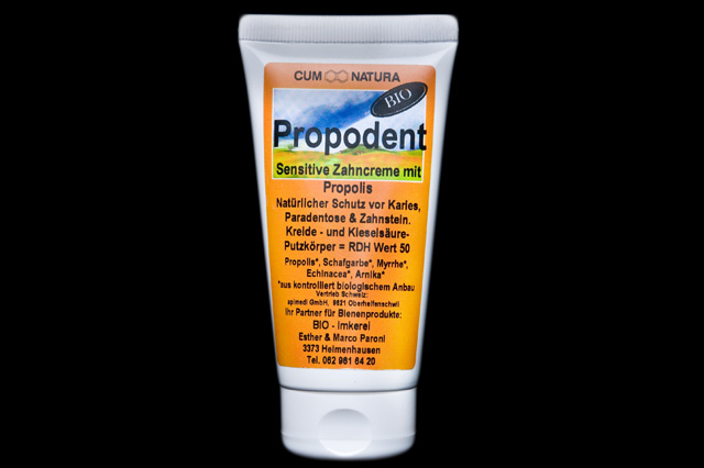 Das ist zu 100 Prozent reine Natur. Die sensitive Zahncreme «Propodent» schützt die Zähne bei täglicher Anwendung vor Paradontose, Karies und Zahnstein. Propolis, Echinacea, Schafgarbe, Myrrhe und Stevia sorgen für eine gesunde Mundflora. Die Konzentration von Propolis wurde kürzlich verdoppelt. Kieselsäure-Putzkörper sorgen für eine sanfte Zahnschmelzpflege. Alle Zutaten sind biozertifiziert. Ohne synthetische Schaumbildner. Dezent und dennoch lang anhaltende Frische durch Spearmint. Der Zuckerersatz Stevia wirkt stark plaquehemmend und stärkt den Zahnschmelz. Schafgarbe, Myrrhe und Echinacea sorgen für eine gesunde Mundflora. Ohne Zusatzstoffe, ohne synthetische Duftstoffe, ohne synthetische Konservierungsmittel.