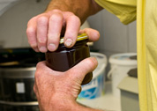 Überproduktion ins Glas. Es gibt zum Glück Jahreszeiten, in denen beim Futter ein Überschuss abfällt, den die Bienen im sogenannten Honigraum über dem Brutraum deponieren. Der Honigraum ist mit einem Königinnengitter vom Brutraum abgetrennt, so dass die Königin nicht hochklettern und ihre Eier in die Honigwaben legen kann. Je mehr Honig oben im Honigraum anfällt, umsomehr Überschuss haben die Bienen produziert und in die Honigwaben eingelagert. Das ist der Honig, den Bioimker Marco Paroni den Bienenwaben entnimmt. Ein Volk produziert bei guter Frühlings- und Waldtracht und bei Wanderungen in der Regel 40 bis 80 Kilogramm Honig pro Jahr für die Gläser und 60 Kilogramm als Wintervorrat für das eigene Wintervolk. Marco Paronis Spitzenvölker lieferten bei sehr guten Trachtverhältnissen schon mal bis zu 160 Kilogramm ins Glas. Magere Jahre mit 10 bis 20 Kilogramm pro Volk kommen ebenso vor. |