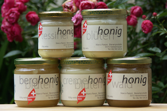 Paronis Blütenhonig, Waldhonig, Bergblütenhonig, Tessiner Honig und Robinienhonig suissebio finden Sie jetzt im 250 g- oder